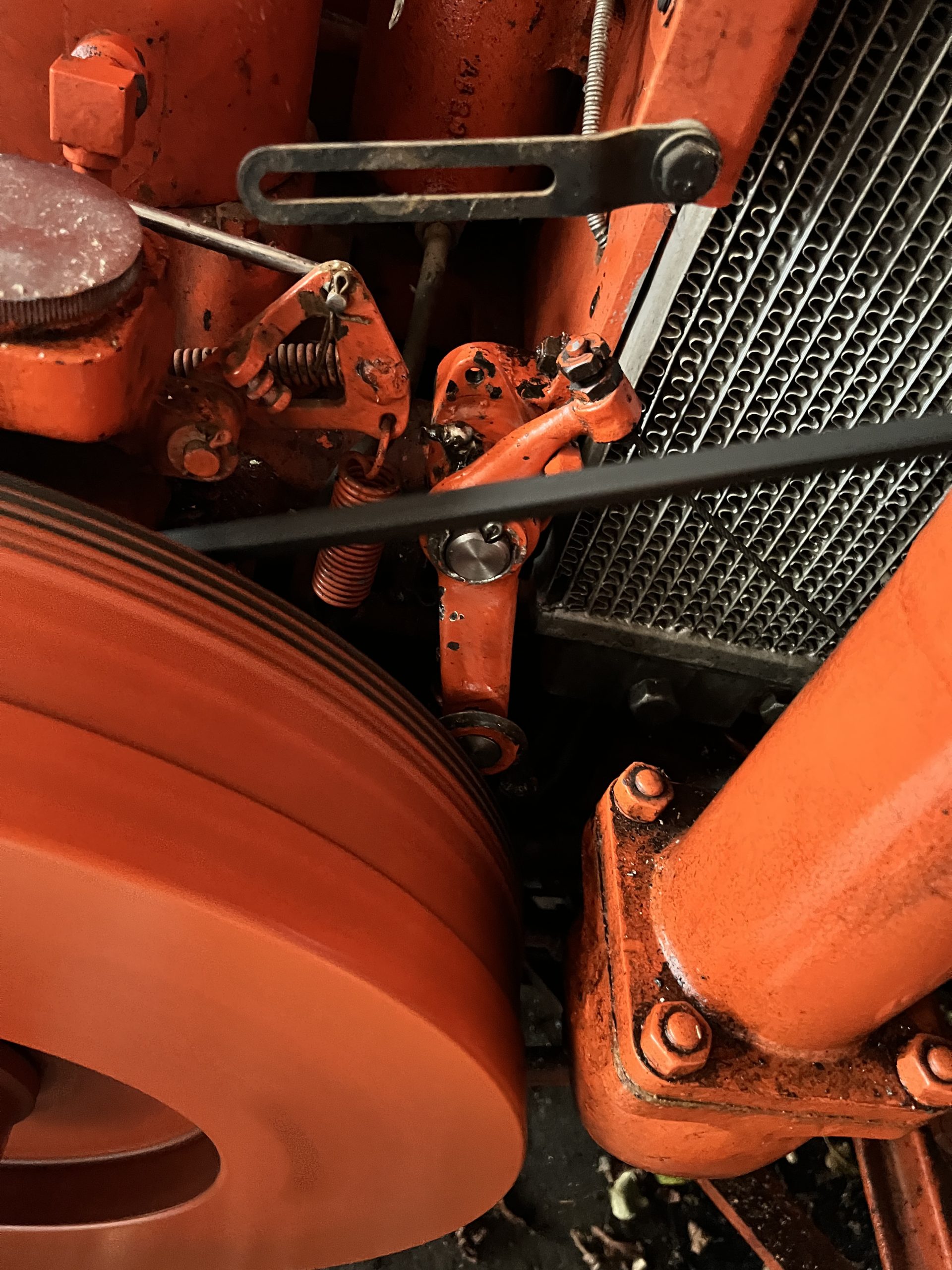 This Field Marshall tractor – a late series 3A model is actually one of our own. It was purchased earlier this year to go alongside our series 2. It had been in a collection for many years and required various small bits of maintenance to allow it to be used. One of these items was the decompressor mechanism. This is a spring loaded plunger with a small wheel on which engages with a spiral groove on the flywheel. It is set on the flywheel to pull open a decompression valve and then as the flywheel is turned with the handle, it travels along the groove until it finally drops off, allowing the decompression valve to close and the tractor to start.